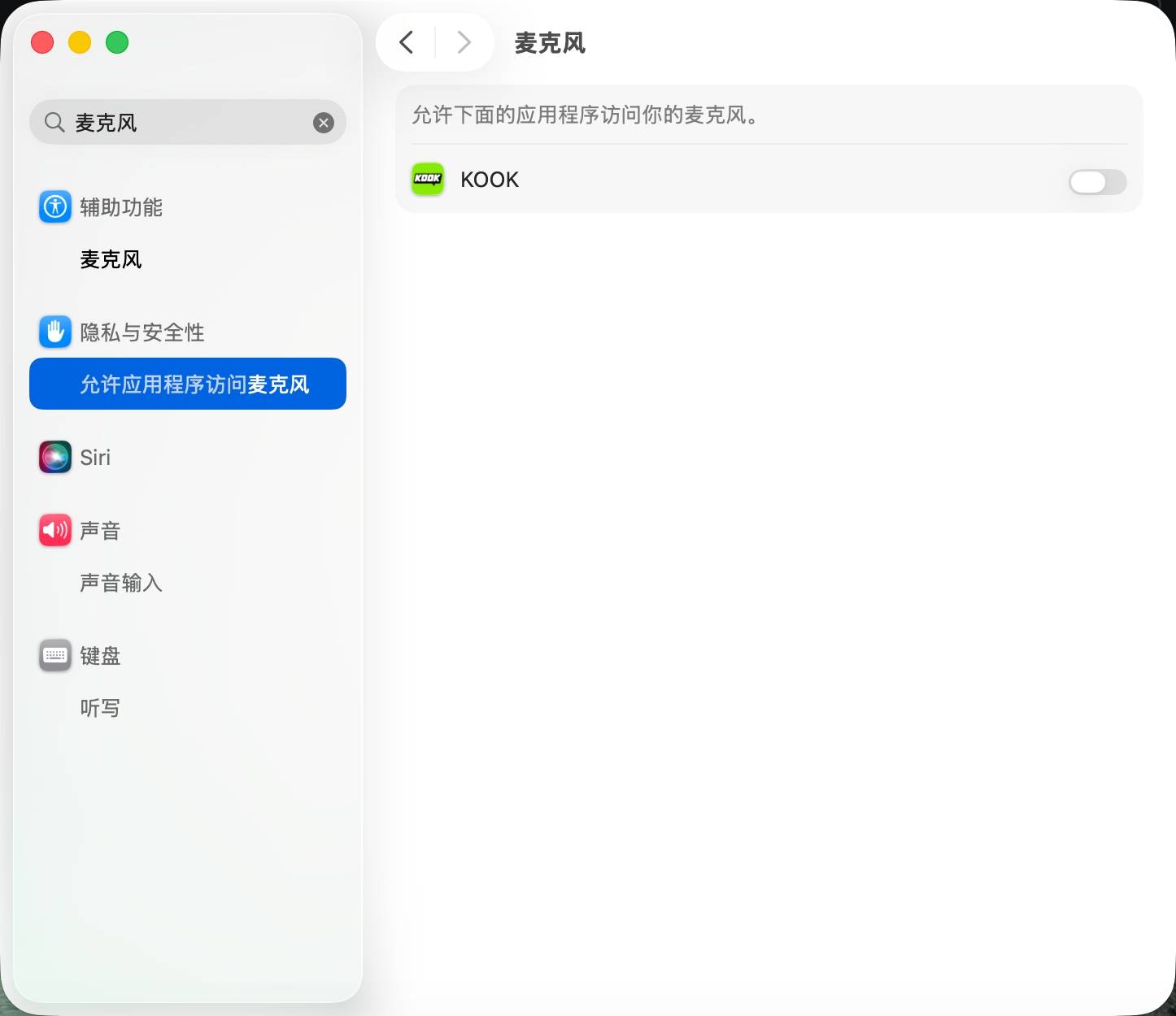 2. 前往系统设置页面,搜索“允许应用程序访问麦克风”,在右侧的应用程序列表中,打开 KOOK 的开关。